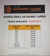 999 24 K RM 276 00 gram 950 23 K RM 262 00 gram 916 22 K RM 253 00 gram 875 21 K RM 242 00 gram 835 20 K RM 231 00 gram 750 18 K RM 207. Kemudahan Membeli Menjual di mana-mana cawangan Ar Rahnu YaPEIM seluruh Malaysia.